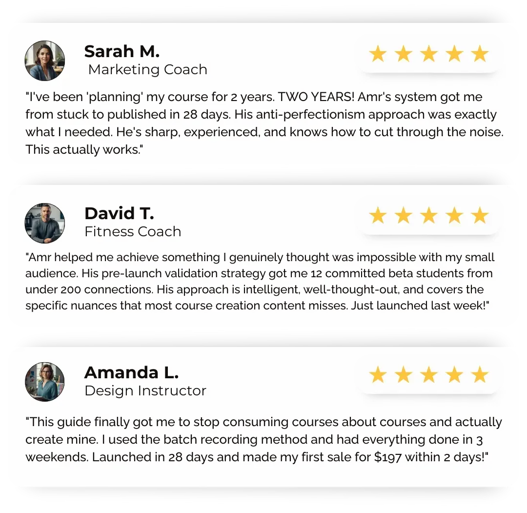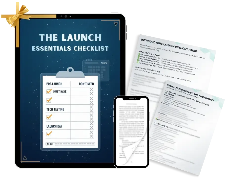 The step-by-step 30-day framework keeps you moving forward. Plus, the pre-launch validation step in MODULE 6 creates accountability - when you have students waiting, you can't quit.